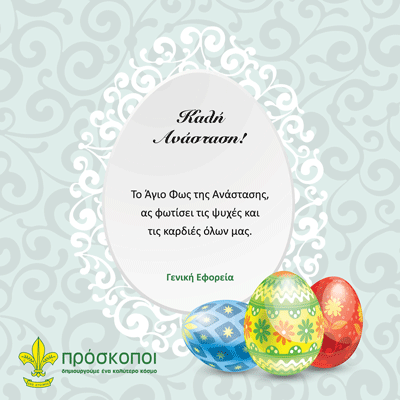 Οι περισσότεροι από εσάς θα συμμετάσχετε και στις Πασχαλινές δράσεις, εκδρομές και κατασκηνώσεις των Τμημάτων σας. Είμαι σίγουρος πως μαζί με τους άξιους Αρχηγούς και τους Βαθμοφόρους σας θα χαρείτε αξέχαστες στιγμές, κοντά στη φύση, αποκτώντας ταυτόχρονα χρήσιμες γνώσεις και δεξιότητες, που θα είναι εφόδια σε όλη σας τη ζωή.